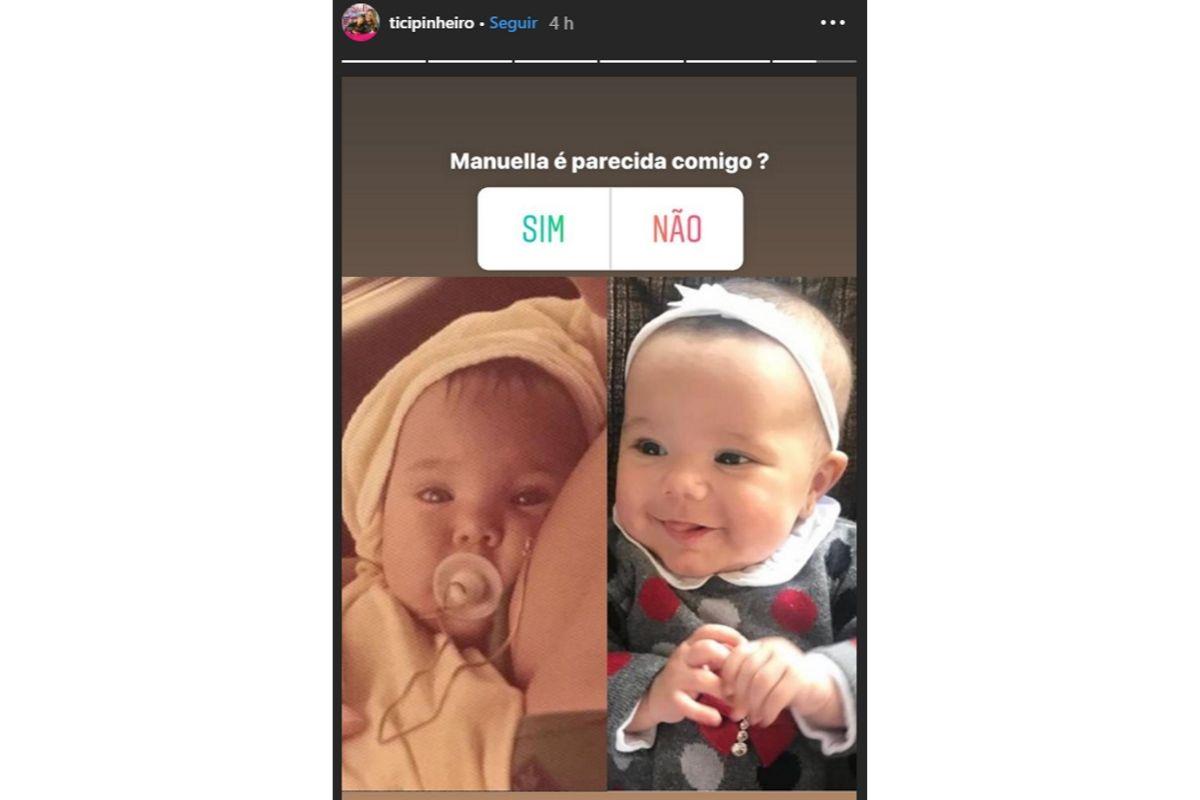 Mas agora, a apresentadora colocou uma montagem nos stories e abriu uma enquete. A foto é uma colagem de uma imagem de quando Tici ainda era bebê e um clique recente de Manuella. Na legenda do post, ela pergunta: “Manuella é parecida comigo?”.