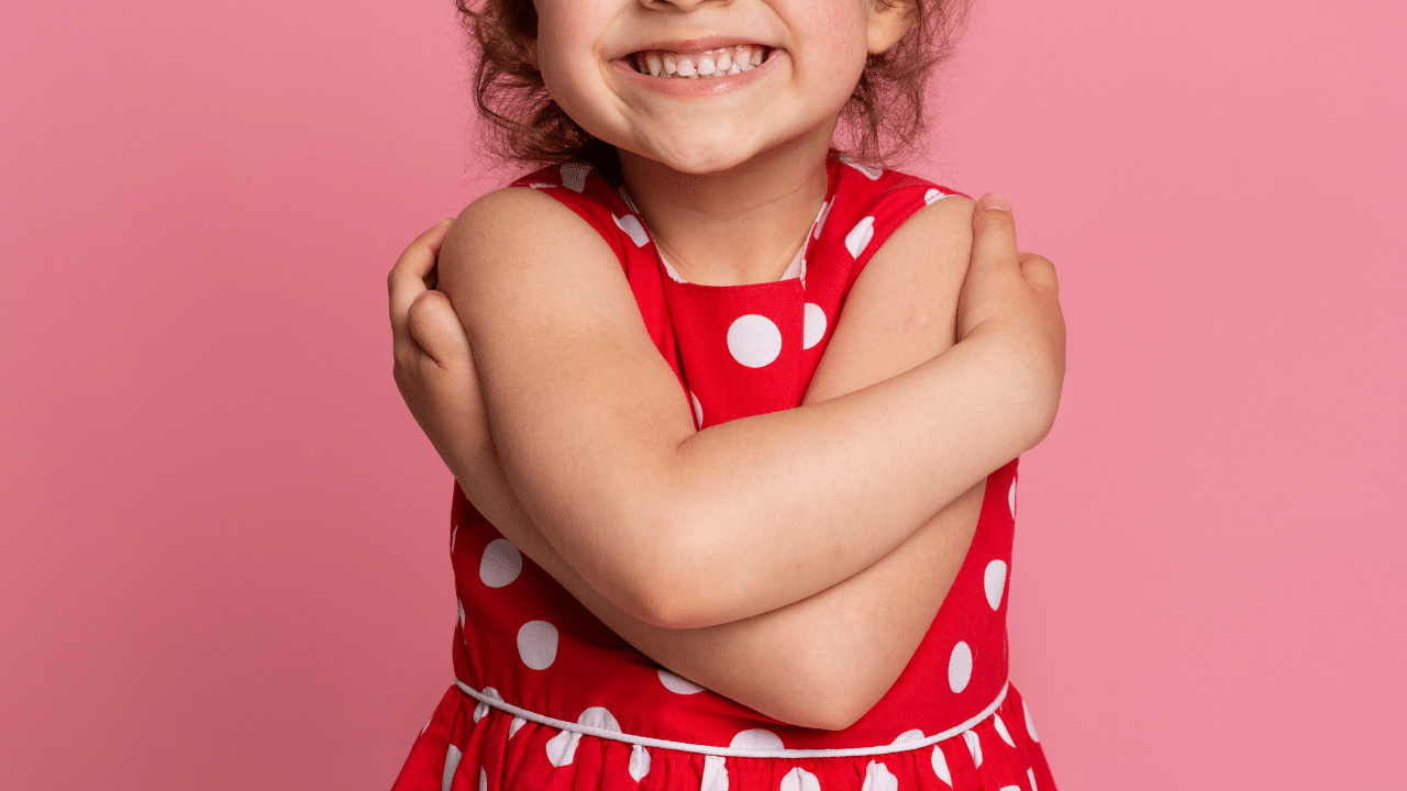 Criança sorrindo em um fundo rosa, com vestidos de bolinhas brancas