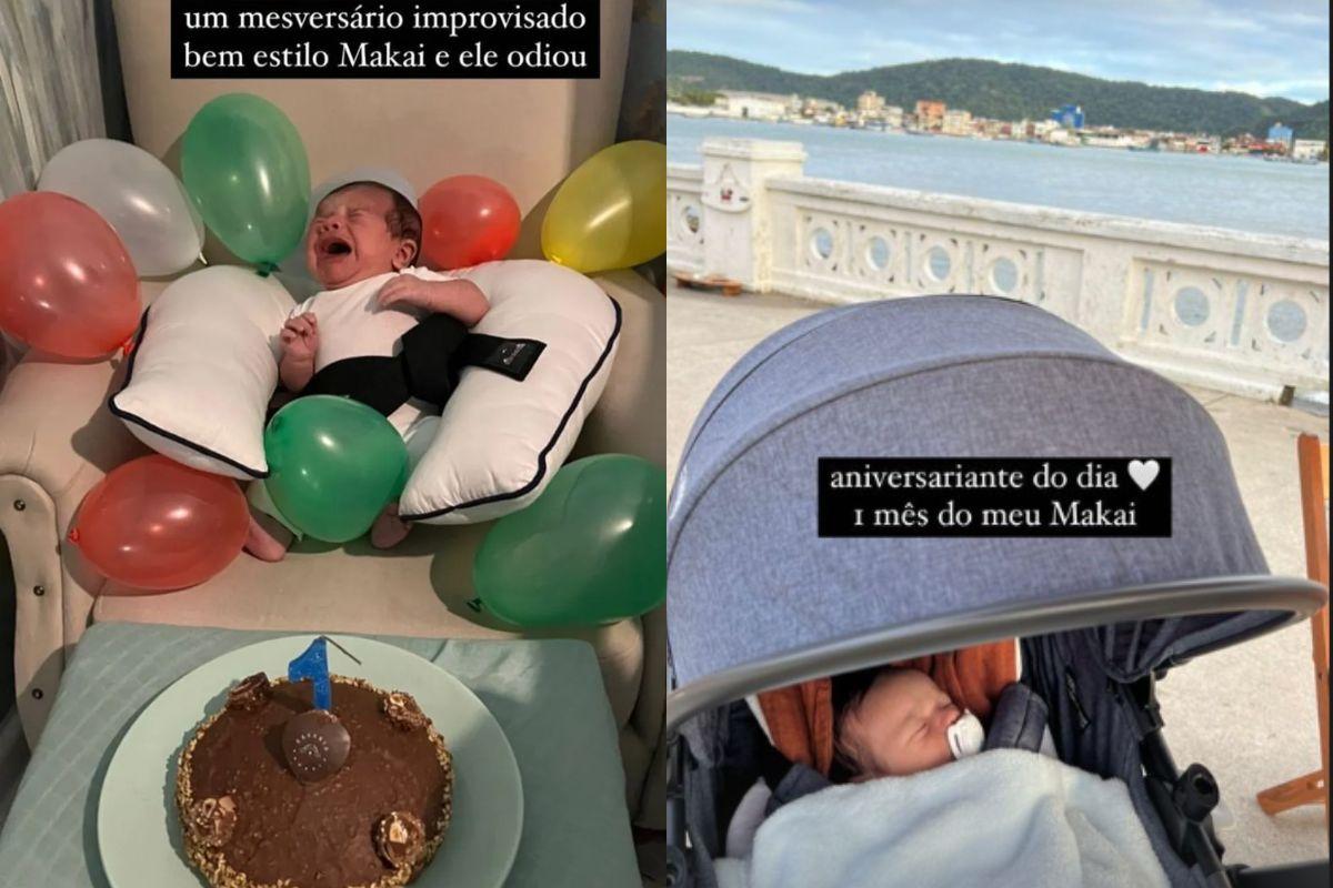“Um mesversário, improvisado bem estilo Makai e ele odiou”, escreveu a mãe na legenda nos Stories do Instagram ao compartilhar registros do mesversário. ‘’Fiz 1 mês e não gostei, mas pelo menos eu sou black belt agora (improvisaram uma festa pra mim) ‘’, brincou ela no feed. Petra mostrou que o aniversariante não estava muito feliz na festa e aparece chorando na imagem.