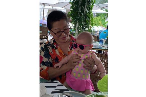 No colo da avó, dona Kika, a bebê também apostou em um óculos rosa para combinar com a roupa de piscina, deixando a cena ainda mais linda!