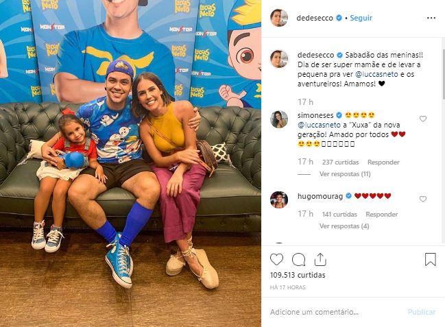 Os seguidores deixaram muitos comentários, inclusive alguns amigos famosos de Deborah. “Luccas Neto é a Xuxa da nova geração! Amado por todos!”, disse a cantora sertaneja Simone, da dupla com Simaria. Hugo Moura, marido de Deborah e pai de Maria Flor deixou um comentário com vários corações. “Minha filha ama também!”, comentou outra seguidora. “É o sonho do meu filho!”, disse outra fã.