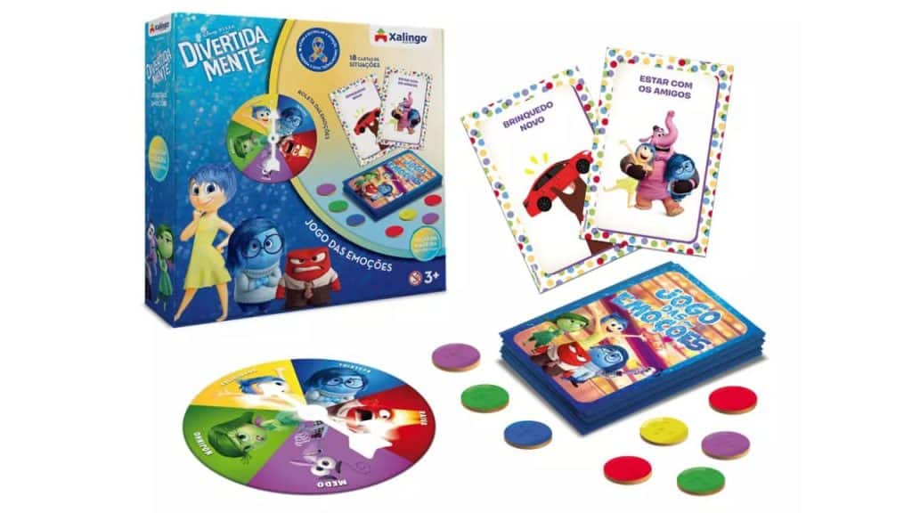 Esse é um jogo para as crianças explorarem os seus sentimentos de uma forma mais lúdica, ao lado dos personagens de Divertidamente. Com 18 cartas e uma roleta, os jogadores identificam situações do dia a dia ligadas a diferentes emoções, desenvolvendo empatia e reconhecimento emocional. É ideal para brincar em família ou em grupo, fortalecendo laços e garantindo boas risadas. Ele é indicado para crianças acima de 3 anos e pode ser encontrado a partir de R$50,00.