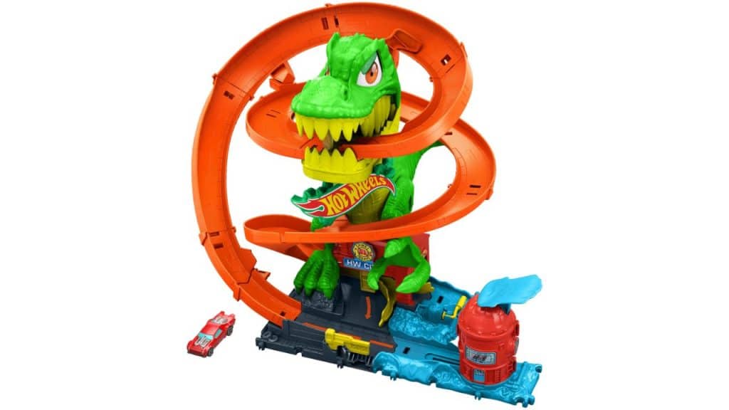 Agora uma opção ótima para os pequenos que gostam de brinquedos mais radicais é uma pista de Hot Wheels temática de dinossauro para enfrentar um T-Rex faminto que invadiu o quartel dos bombeiros. Recomendado para crianças a partir de 4 anos, pode ser encontrado por R$279,99.