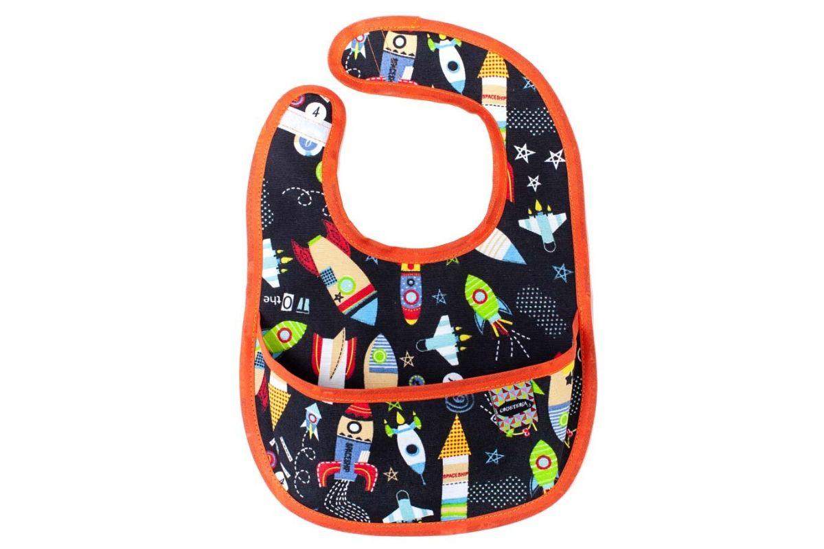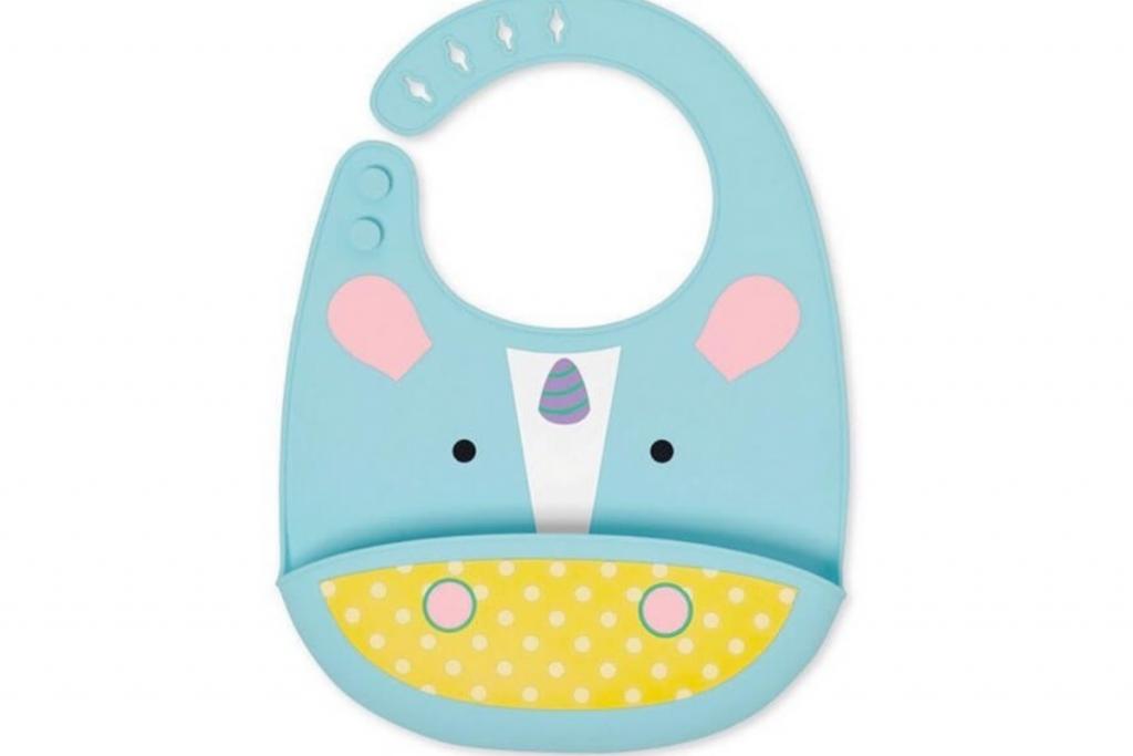 Tem alça ajustável para o conforto da criança e um bolso profundo cata-migalhas. SKIP HOP, R$40,00, ficoupequeno.com