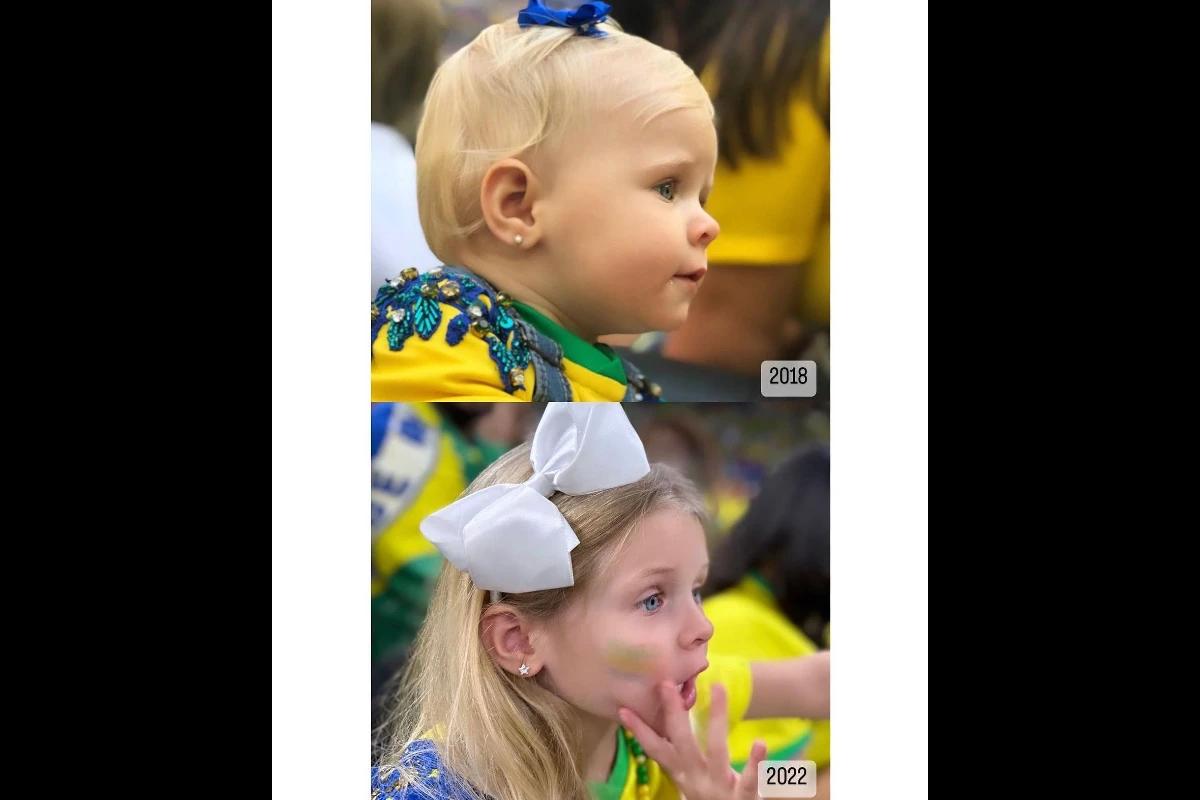Na imagem, a mãe fez uma comparação e mostrou o antes e o depois da criança. Com o espaço de tempo de quatro anos, desde a última Copa do Mundo em 2018, a menina que era um bebê, hoje, na Copa de 2022 já se mostra crescida. “E 4 anos depois…”, escreveu Natália na legenda da publicação.