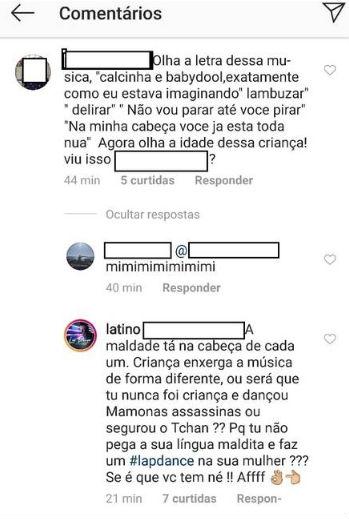 “Olha a letra dessa música: ‘calcinha e babydool, exatamente como eu estava imaginando… ‘lambuzar”, ‘delirar’, ‘Não vou parar até voce pirar’, ‘Na minha cabeça você já esta toda nua’. Agora olha a idade dessa criança!”, escreveu um seguidor. “Latino, tem maldade sim. Muito feio uma criança dançando essa música. O que acontece é que as crianças não querem ser mais crianças. E os pais acham normal isso”, disse outra seguidora também criticando.