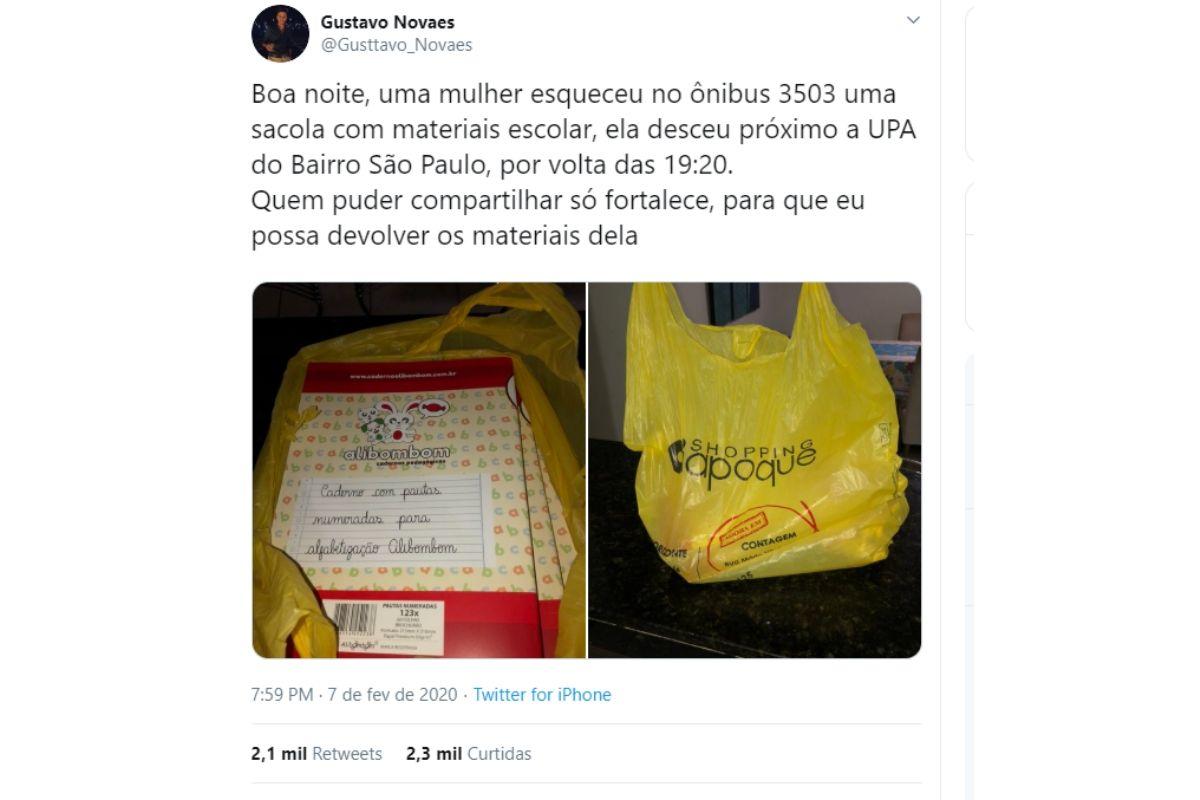 Ao publicar no Twitter fotos do material escolar e a explicação do que tinha acontecido, o post viralizou até que chegou aos olhos da mãe que havia esquecido a sacola. “Tentei achar o telefone da garagem de ônibus, mas não consegui. Quando corri pra internet pra pedir ajudar, vi a publicação do Gustavo”, contou ela.
