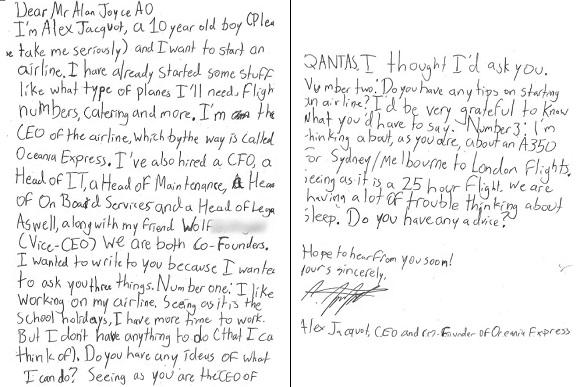 Alex Jacquot é um garoto australiano de 10 anos que sonha em abrir uma empresa de transporte aéreo. Pode parecer brincadeira de criança, mas o menino está muito sério, e ele deixou isso claro na carta que escreveu para Alan Joyce, o CEO da Qantas Airways, maior empresa aérea da Austrália.