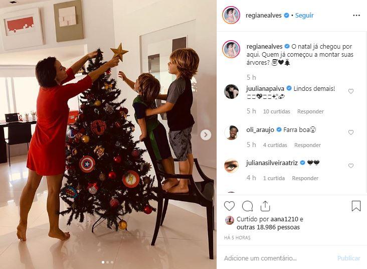Na quinta-feira, 21 de novembro, a atriz publicou uma foto em seu Instagram decorando a casa ao lado dos meninos. “O Natal já chegou por aqui. Quem já começou a montar suas árvores?”, disse Regiane na legenda da publicação. A árvore chamou a atenção dos seguidores porque todos os enfeites eram com tema de super-heróis: Capitão América, Homem Aranha e Flash são alguns dos personagens que decoraram a árvore.