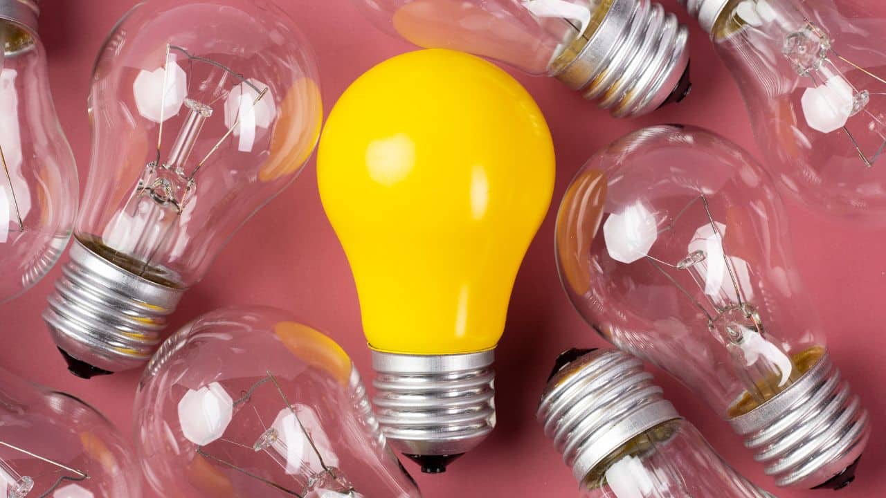 Lâmpada colorida no meio de lâmpadas transparentes representando um superdotado.