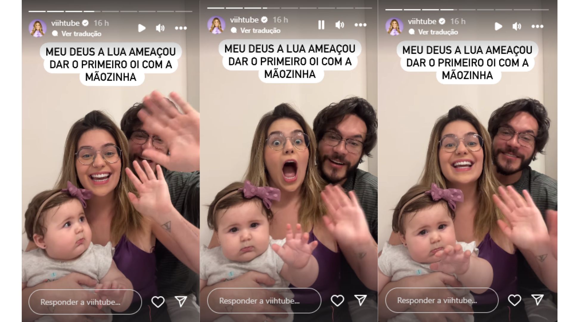 “Meu Deus, a Lua ameaçou dar o primeiro oi com a mãozinha”, escreveu Viih ao publicar o vídeo na rede social. Diante da reação da filha, Eli e Viih seguiram acenando com a mão e falando “oi” e ela respondeu levantando de novo a mão.