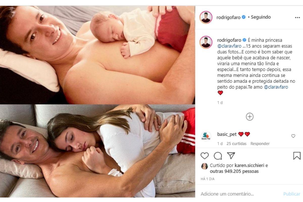 “É minha princesa @claravfaro… 15 anos separam essas duas fotos… E como é bom saber que aquele bebê que acabava de nascer, viraria uma menina tão linda e especial… E tanto tempo depois, essa mesma menina ainda continua se sentido amada e protegida deitada no peito do papai. Te amo”, declarou o pai famoso ao compartilhar a montagem de fotos.