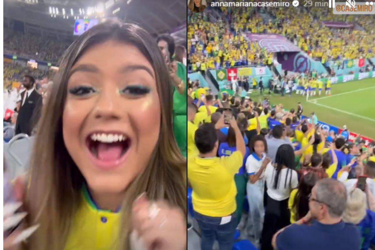 O jogador Casemiro fez um gol durante a partida contra a Suíça e a esposa dele, Ana Mariana Casemiro compartilhou nos Stories a reação na hora que o marido fez o gol.