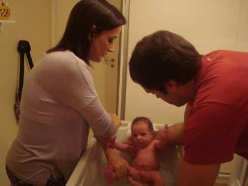 Feito isso, foi a hora de banhar o corpo. Fabiana não se propôs em nenhum momento a segurar Carolina, assumiu que tinha medo. “Ela ainda é muito pequena.” Mas executou com dedicação a função de lavar cada dobrinha. A cada sinal de chorinho, ela se apressava e Bruno continuava a bater papo com Carol. Bruno parecia mais leve, apreciando o momento, sem tanta preocupação. Fabiana, mais nervosa, esperava terminar e amamentar logo. Os sentimentos eram diferentes, mas, no final, ambos, cada um à sua maneira, cumpriram o mesmo objetivo: deixar Carol cheirosa e limpinha.