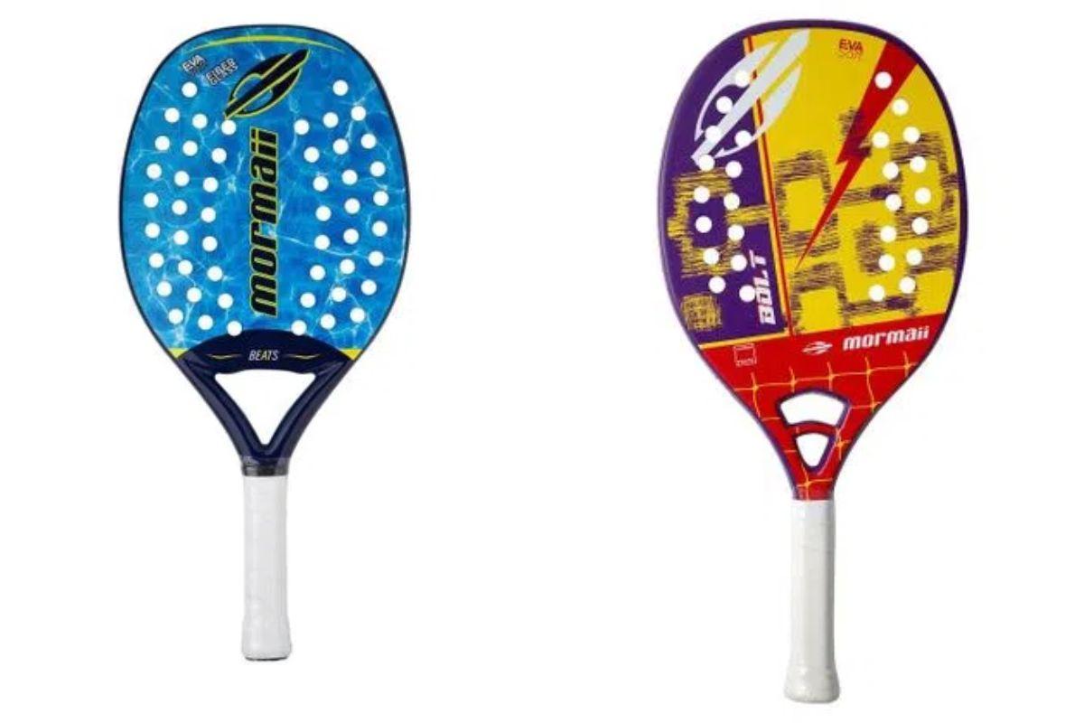 – Raquete Beach Tennis Mormaii Bolt: Frame em carbono e face em fibergalss. Possui eva de alta qualidade, além de ótima elasticidade e resistência, possui 28 furos e coração com 2 furos. É recomendada para nível intermediário.