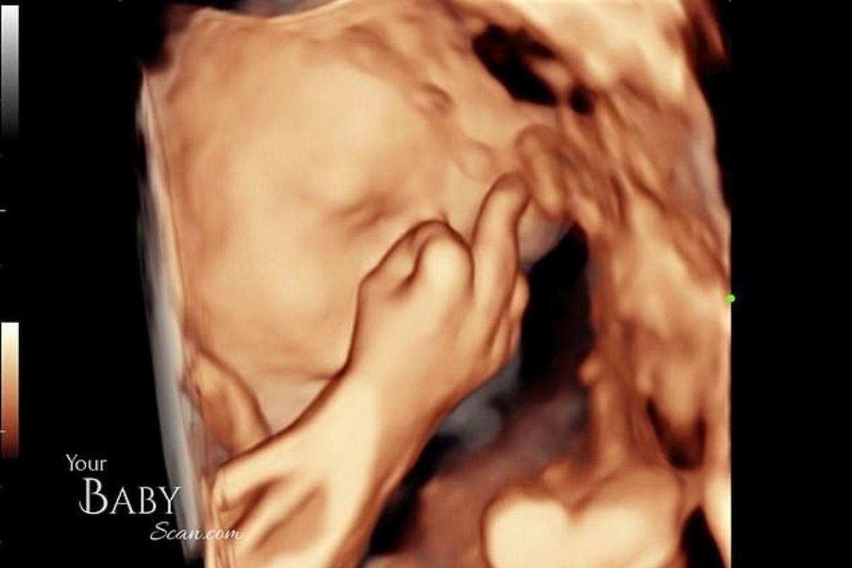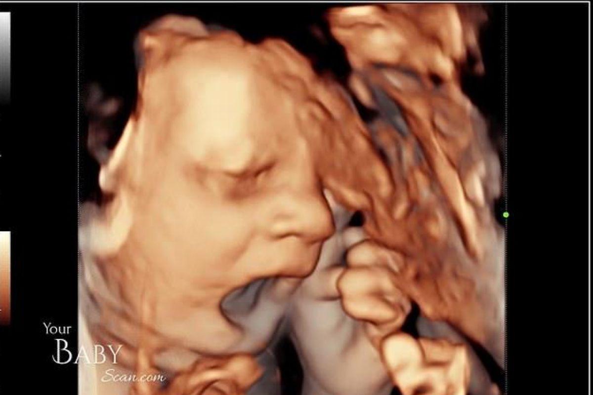 O bebê aparece bocejando e mostrando o dedo durante a ultrassom 4D.