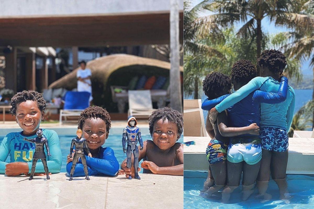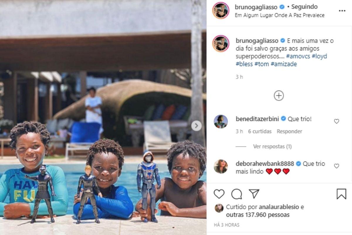 O ator Bruno Gagliasso usou o Instagram nessa sexta-feira, 30 de outubro, para compartilhar uma foto cheia de amor entre o filho, Bless, e mais dois amigos. Na imagem, os três parecem em uma piscina, brincando com bonecos de super-heróis. Na legenda, ele fez uma relação com os garotos e os bonecos. Bruno também é pai de Titi e Zyan, fruto do relacionamento com a apresentadora Giovanna Ewbank.