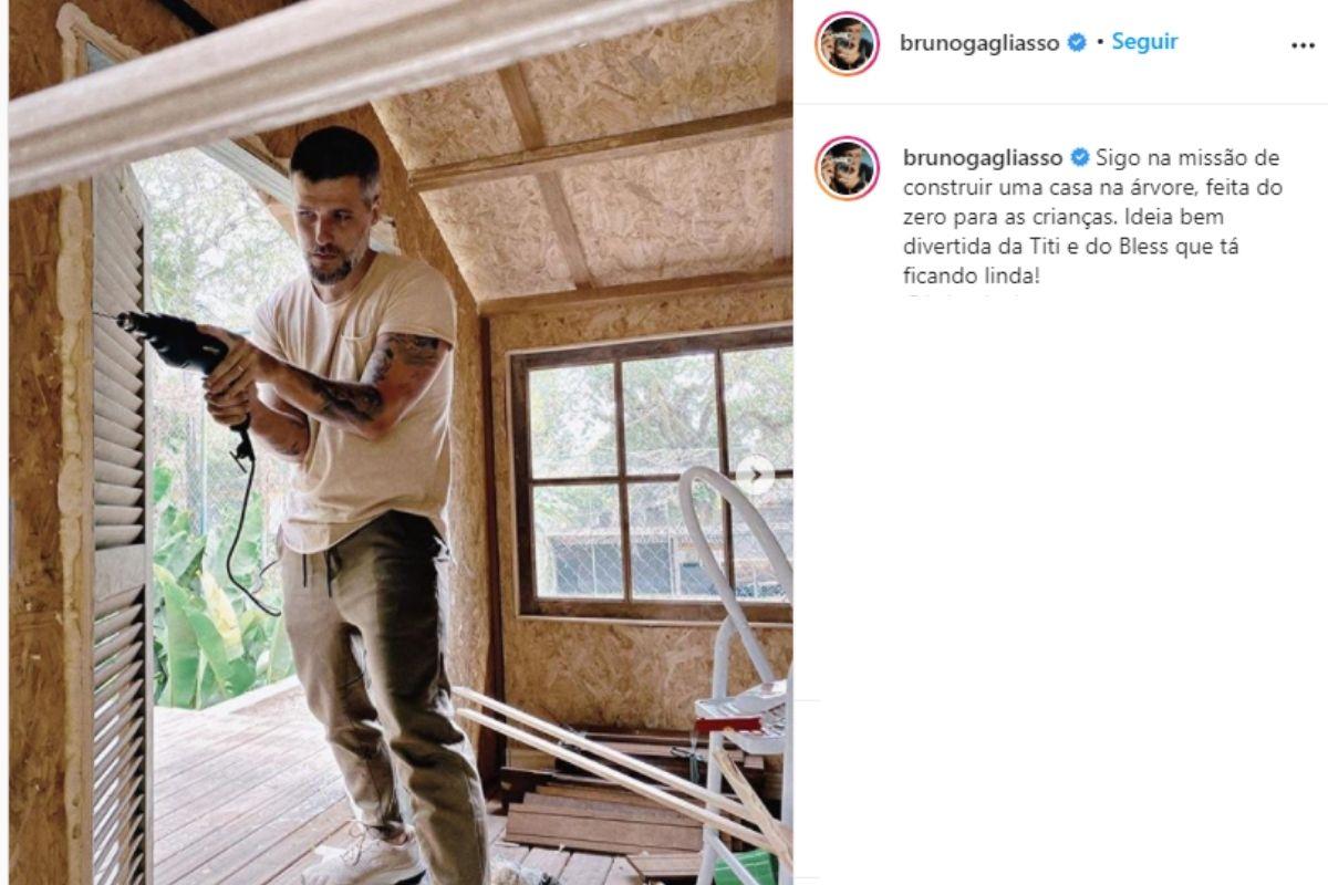 Na foto publicada pelo Instagram, Bruno aparece perto da porta segurando uma furadeira. “Sigo na missão de construir uma casa na árvore, feita do zero para as crianças. Ideia bem divertida da Titi e do Bless que tá ficando linda!”, escreveu o pai na legenda da imagem. Todo o processo de construção do novo cômodo está sendo publicado por Bruno pelas redes sociais, onde o ator mostra o avanço da obra que começou em setembro.