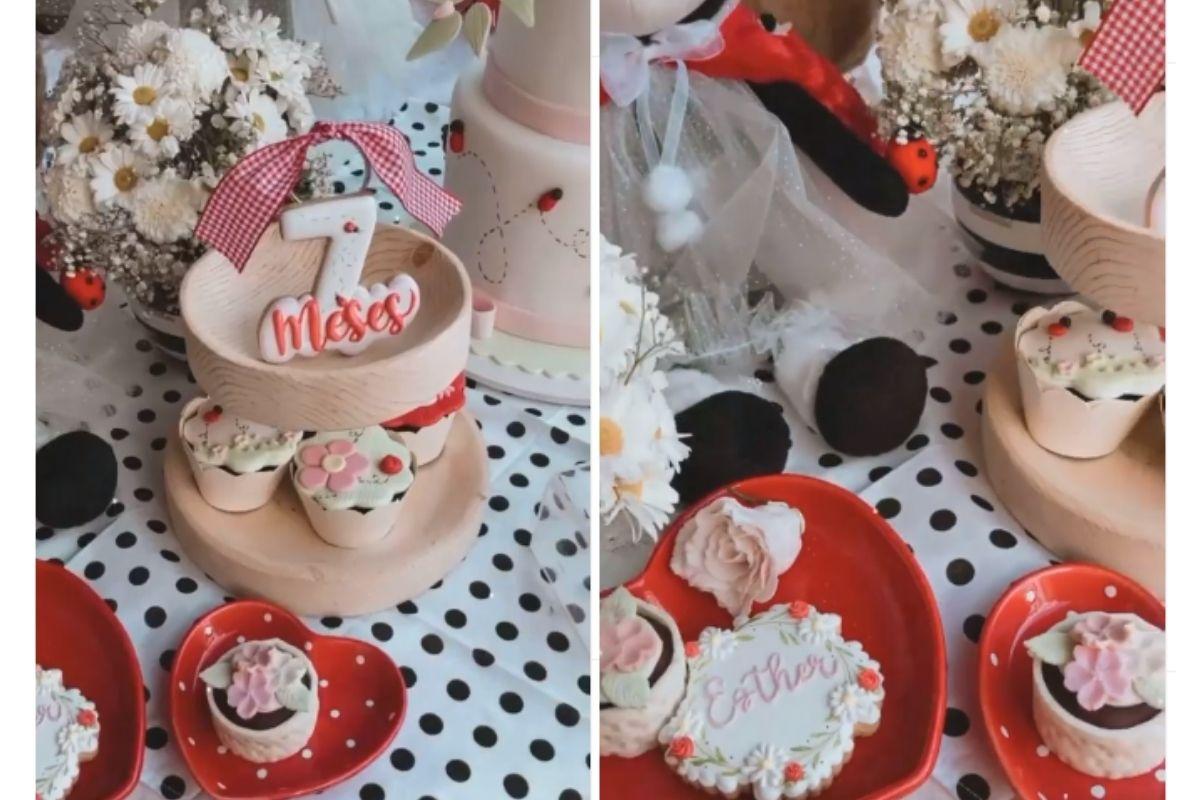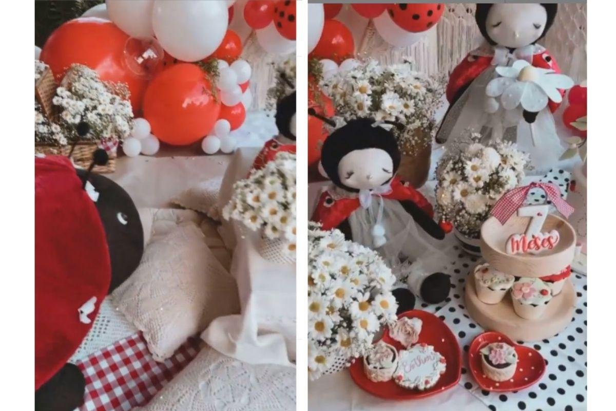 A comemoração contou com cupcakes e docinhos personalizados, além de um bolo temático de dois andares com o escrito “Esther 7 meses”. A comemoração foi intimista e foi feita ao ar livre. Nas redes, Carol Dias fez várias publicações do momento, com fotos da filha e fotos e vídeos da decoração.