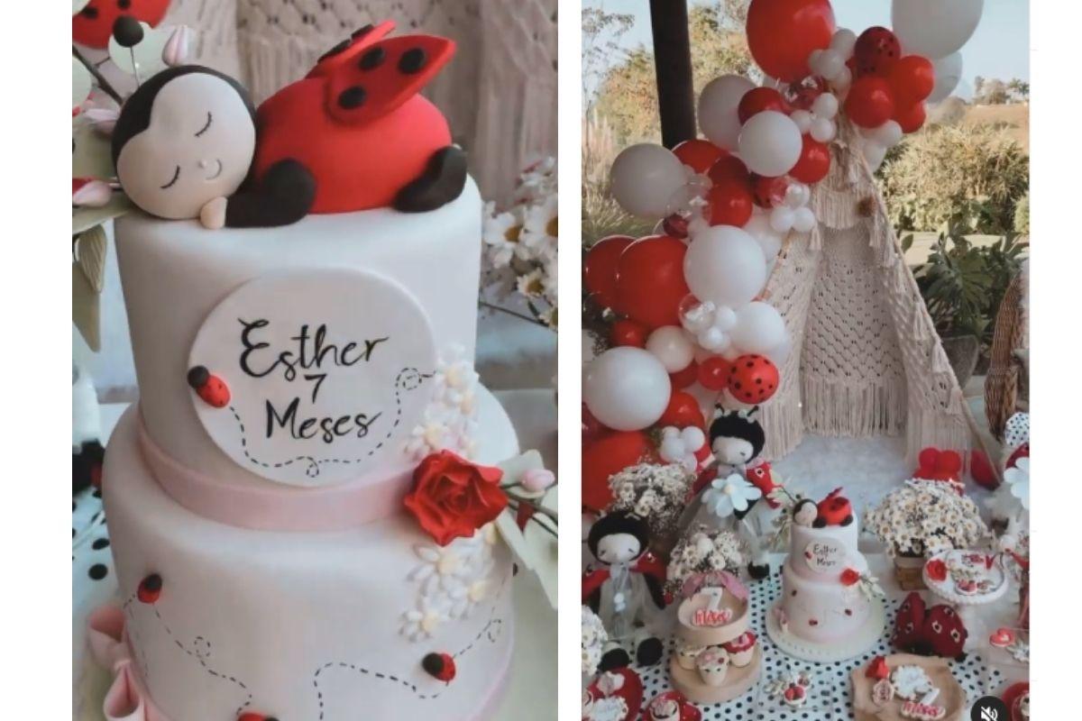 O 7° mesversário de Esther foi decorado com o tema “Joaninha”. A decoração contou com balões vermelhos, brancos e pretos, além de várias joaninhas de pelúcia e flores espalhadas. Toda a festa foi feita nas cores vermelha, branca e preta, inclusive as toalhas e bolo.