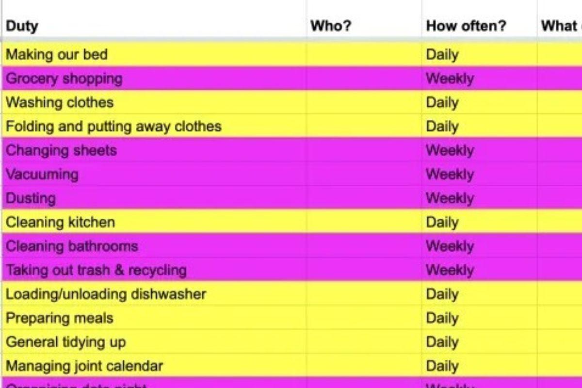 Dividir as tarefas em casa pode ser melhor do que terapia para uma casal. Isso mesmo! Foi o que aconteceu com o casal norte-americano, de Tennessee, Tara Blair Ball, de 38 anos, e Brian, de 46, depois do nascimento da filha caçula, Brienne, em outubro de 2020. Em entrevista ao The Sun, Tara conta que criou uma planilha dividida por cores, que detalha os trabalhos domésticos semanais e diários de cada um. O objetivo era um só: que ninguém ficasse sobrecarregado!