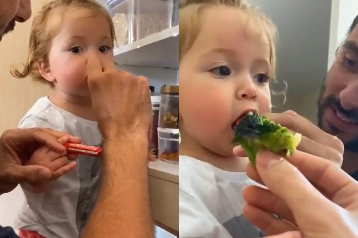 Claudia Leitte, então, tenta trocar o doce por um brócolis, enganando a bebê. “Tome, tome chocolatinho! Coma árvore, filha! Ô que delícia!”, falou, ao entregar o vegetal à criança. Bela chegou a pegar o brócolis e comer um pedaço. A bebê, no entanto, não gostou do sabor e acabou cuspindo. “O que foi? Você ri cuspindo?”. Márcio volta ao armário de doces e oferece mais. “Tu quer qual? Onde é?”, perguntou o pai. “Olha o pai estragando a criança”, brincou Claudia.