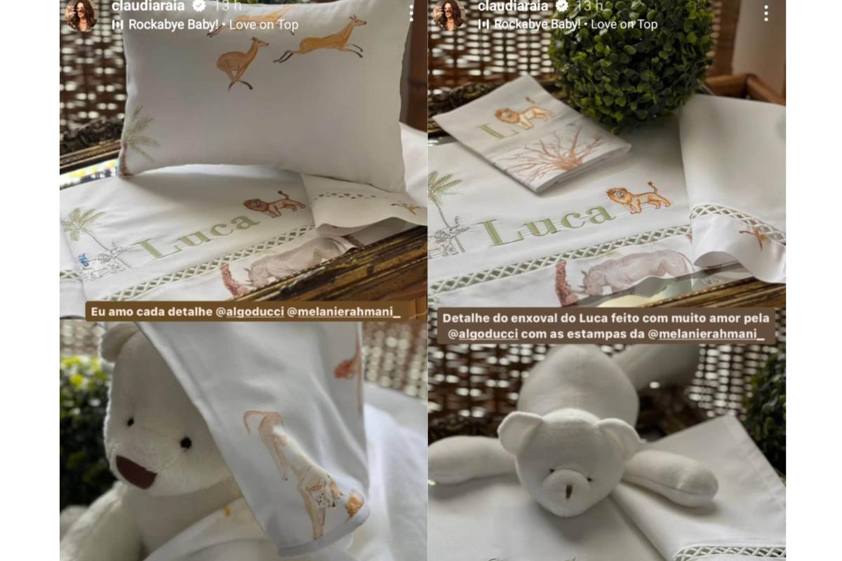 Nos stories da rede social, a mãe publicou registros onde mostra os lençóis, fronhas de travesseiro e outros itens de cama do bebê, todos em tons claros de branco e verde. O tema escolhido para ilustrar o enxoval foi de safari, assim como o quanto inteiro da criança. E é claro que o nome ‘Luca’ foi gravado em todas as peças para deixar tudo ainda mais personalizado.