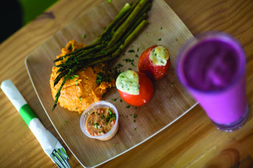 Purê de batata doce, tomate recheado e aspargos: opção deliciosa para os vegetarianos!