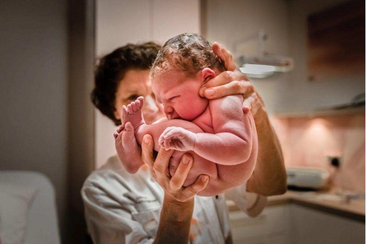 O momento do nascimento do bebê e a emoção que a mãe transborda ao segurá-lo pela primeira vez.