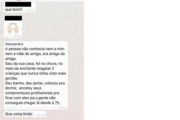 No WhatsApp, Alessandra estava emocionada com a ação de Patrícia. “Saiu de sua casa, foi na chuva, no meio da enchente resgatar duas crianças que nunca tinha visto mais gordas. Deu banho, deu jantar, colocou para dormir”, contou.