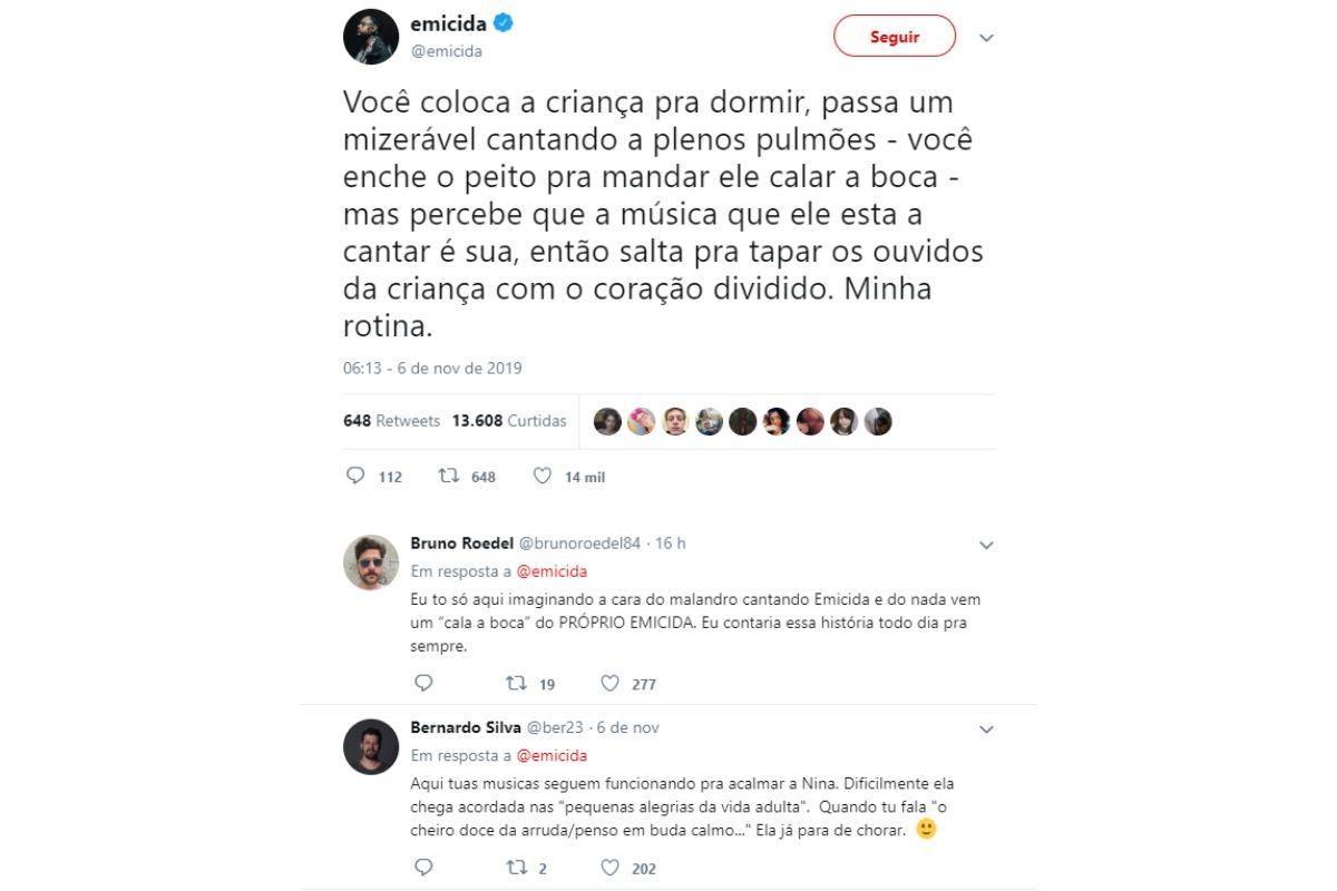 As respostas são as melhores: “Eu to só aqui imaginando a cara do malandro cantando Emicida e do nada vem um “cala a boca” do PRÓPRIO EMICIDA. Eu contaria essa história todo dia pra sempre”, disse um. Outro fã até comentou que usa as músicas do MC para acalmar a filha. “Aqui tuas músicas seguem funcionando pra acalmar a Nina. Dificilmente ela chega acordada nas “pequenas alegrias da vida adulta”. Quando tu fala “o cheiro doce da arruda/penso em buda calmo…” Ela já para de chorar”. Mas a maioria das pessoas estava apenas rindo e rindo muito.