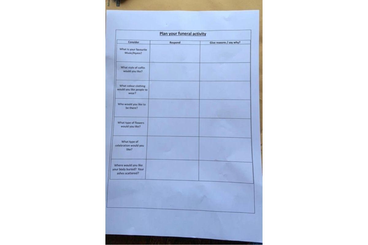 Na atividade, era pedido para que escolhessem o tipo favorito de caixão, além das músicas que poderiam ser tocadas durante a despedida. Como se isso não bastasse, as crianças decidiriam decidir a lista de convidados, as flores e optar por serem enterradas ou cremadas.