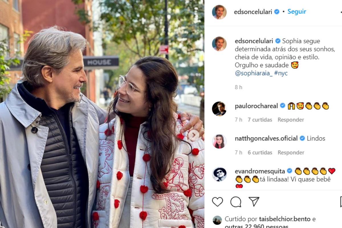 Edson também não escondeu o orgulho que sente pela filha que mora atualmente no estrangeiro. Nas fotos publicadas pelo ator e diretor, pai e filha aparecem sorrindo com roupas de frio e se abraçando. Na legenda da postagem, o ator não escondeu o orgulho pela filha que vive longe do Brasil. “Sophia segue determinada atrás dos seus sonhos, cheia de vida, opinião e estilo.