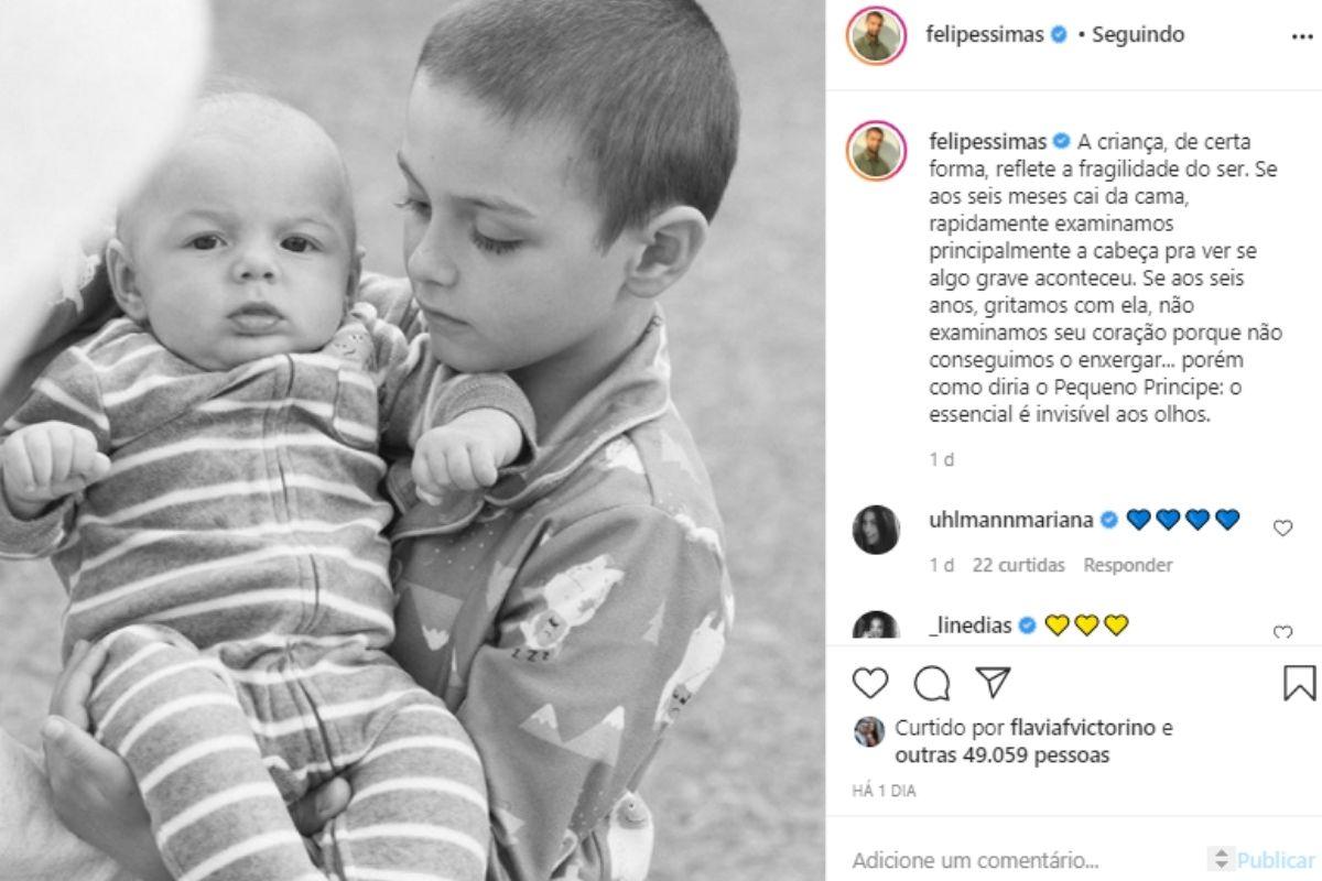O ator Felipe Simas usou as redes sociais no último domingo, 11 de outubro, para compartilhar uma foto cheia de amor entre os filhos, Joaquim, de 6 anos e Vicente, de 7 meses. Na imagem, compartilhada no Instagram, o mais velho aparece com o caçula no colo. Junto com a foto, o famoso fez uma linda reflexão sobre a infância.
