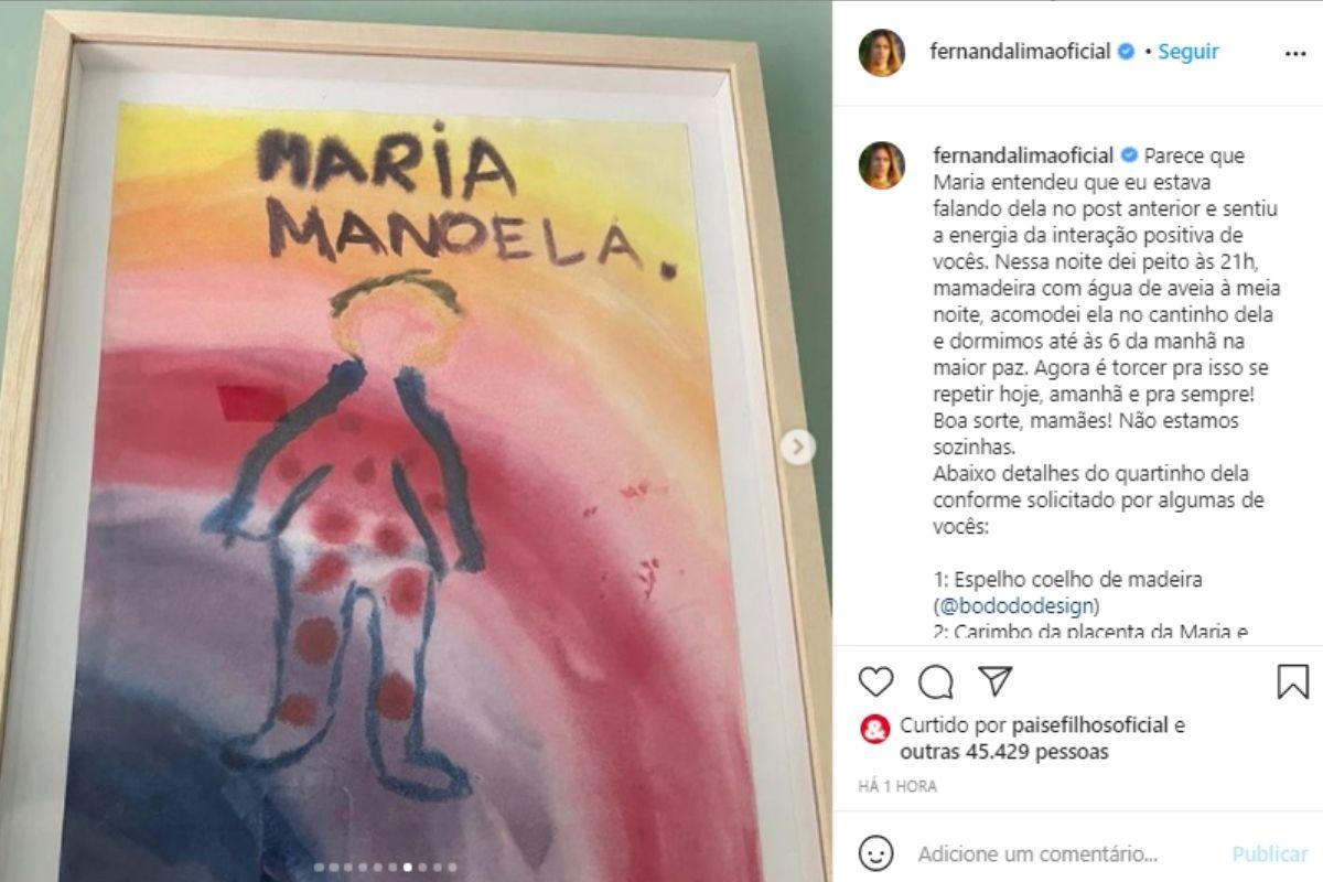 Após publicar um desabafo de que a filha não estava dormindo muito bem, Fernanda celebrou a noite de sono em paz que caçula teve. “Parece que Maria entendeu que eu estava falando dela no post anterior e sentiu a energia da interação positiva de vocês. Nessa noite dei peito às 21h, mamadeira com água de aveia à meia noite, acomodei ela no cantinho dela e dormimos até às 6 da manhã na maior paz”, comemorou.