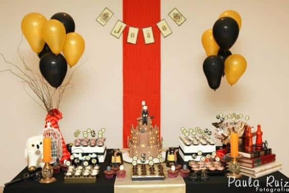 O bruxinho mais famoso do mundo é mesmo inspirador para decorar uma festinha. Corujas de pelúcia e balões metalizados são boas dicas. Inspiração: Cogumellow / Atelier Maria Formiga