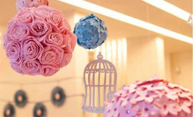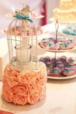 A mesa de docinhos também fica personalizada, com gaiolas, rosas e cores suaves. Inspiração: Cogumellow / Madame Tutu