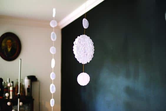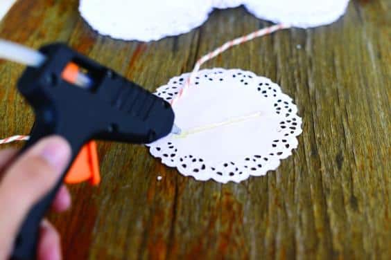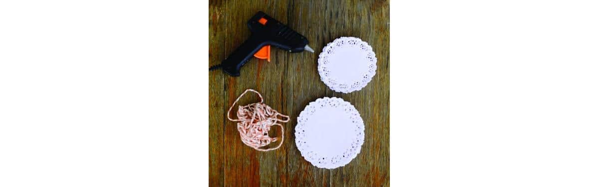 Você vai precisar de cola quente; barbante colorido; apoios redondos de papel rendados para copos e xícaras