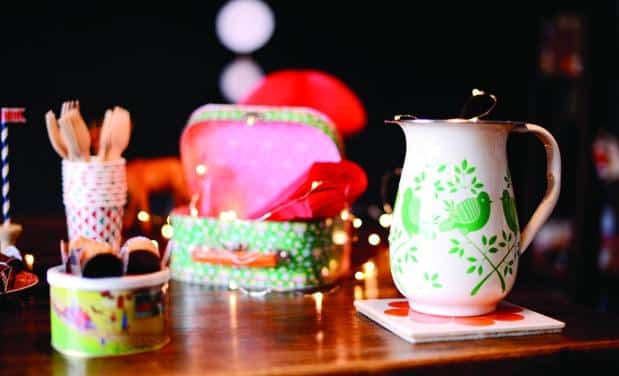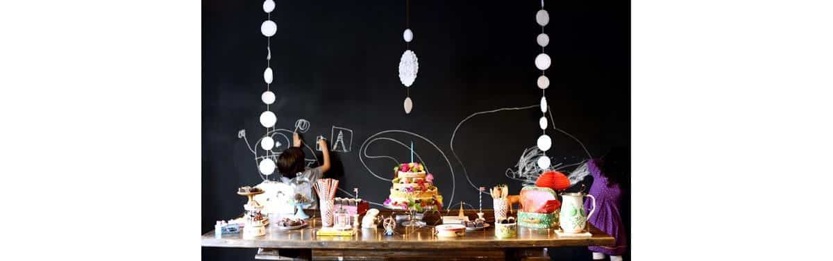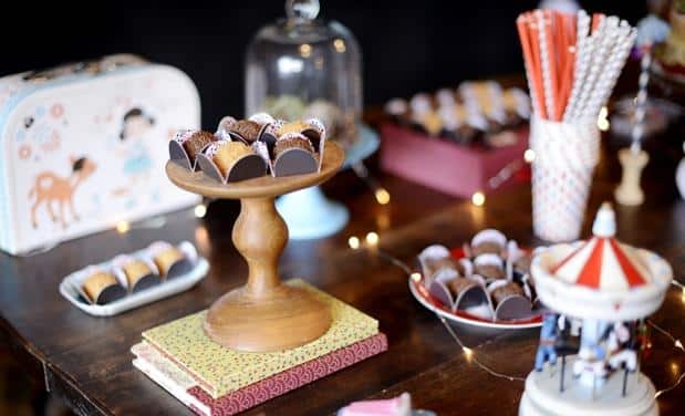 A mesa pdoe estar cheia de objetos garimpados da casa mesmo. Se tiver um brinquedo vintage e um carrossel, perfeito!