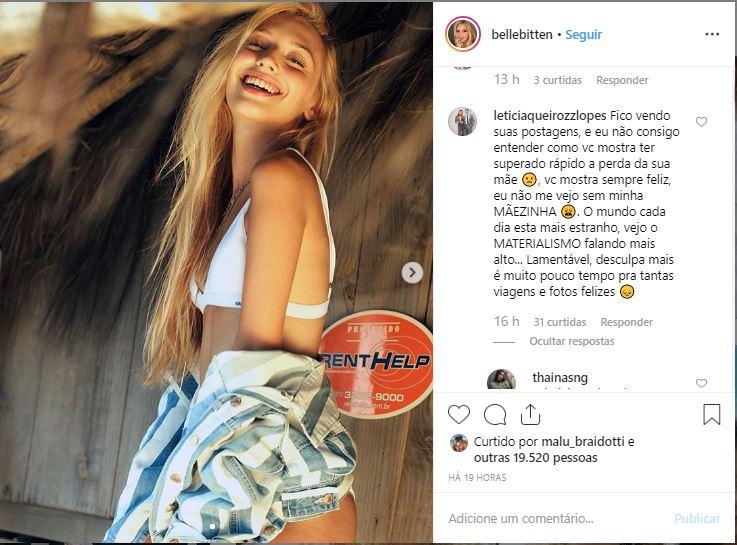Em outra publicação de Isabelle, outra seguidora comentou: “3 meses que sua mãe faleceu e você consegue sorrir e ainda posar linda e maravilhosa. Fim dos tempos”. Mas, dessa vez, Isabelle se posicionou e decidiu responder a usuária. “Oi, tudo bem? Não sou muito de ler comentários, mas não pude deixar de ler o seu. Infelizmente uma parte de mim se foi, mas outra parte está viva e precisa se recuperar! Da mesma maneira que você, eu tive uma perda muito grande, mas meu dia a dia não é o Instagram, meu dia a dia não se resume em uma foto, eu não sou uma foto, eu não sou uma rede social!”, disse.