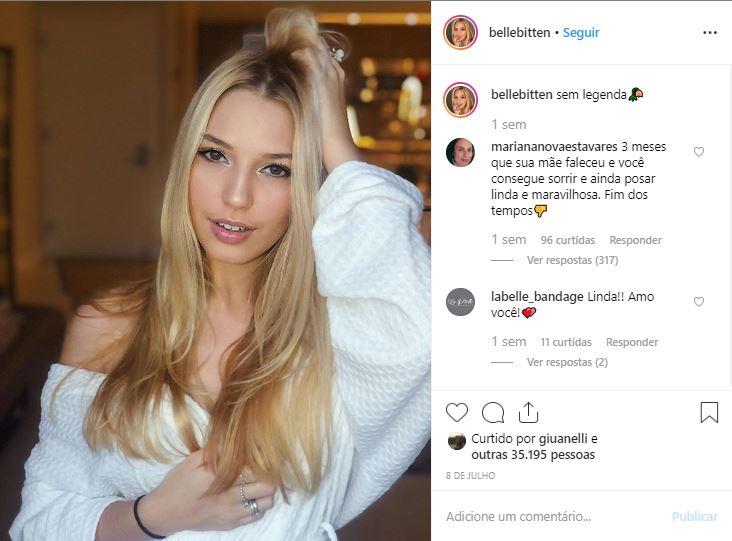 A adolescente de 17 anos agora, além de sentir saudades da mãe, está sendo acusada por várias pessoas de aproveitar a morte de Caroline para se promover na Internet. Vale lembrar que logo que o falecimento da modelo teria sido anunciado, Belle se afastou das redes sociais e ficou um tempo sem postar nada.