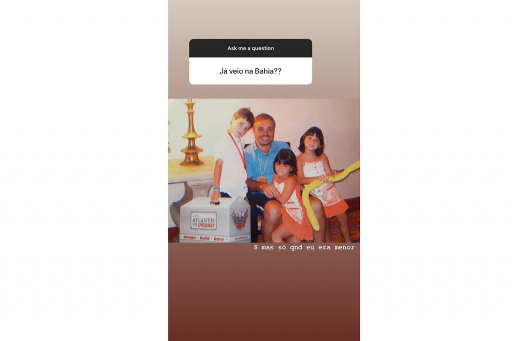 Ela compartilhou a foto enquanto respondia algumas perguntas dos internautas. Marina mostrou a foto ao ser perguntada sobre se já esteve na Bahia. “Sim, já fui para a Bahia, mas só quando eu era menor”.