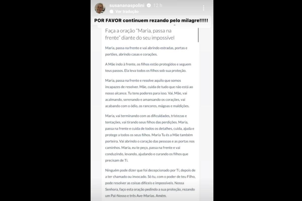 A jovem, que tem 16 anos de idade, surgiu na sessão de stories da plataforma para comunicar os seguidores da mais velha. “Para quem não sabe, eu sou a Júlia, filha da Susana. Eu acabei de conversar, a gente está aqui em São Paulo, ela está internada aqui há uma semana aqui. Ela já vinha de umas internações do Rio. A gente veio para São Paulo porque o médico dela é daqui”, iniciou a filha.