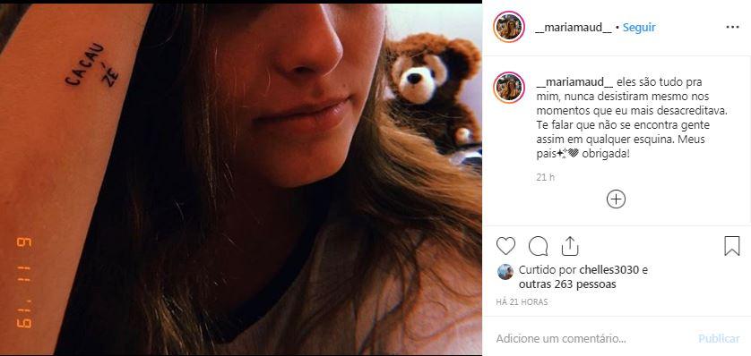 “Eles são tudo pra mim, nunca desistiram mesmo nos momentos que eu mais desacreditava. Te falar que não se encontra gente assim em qualquer esquina. Meus pais. Obrigada!”, disse Maria na legenda da publicação. Maria tatuou os apelidos dos pais, Cacau e Zé, no pulso.