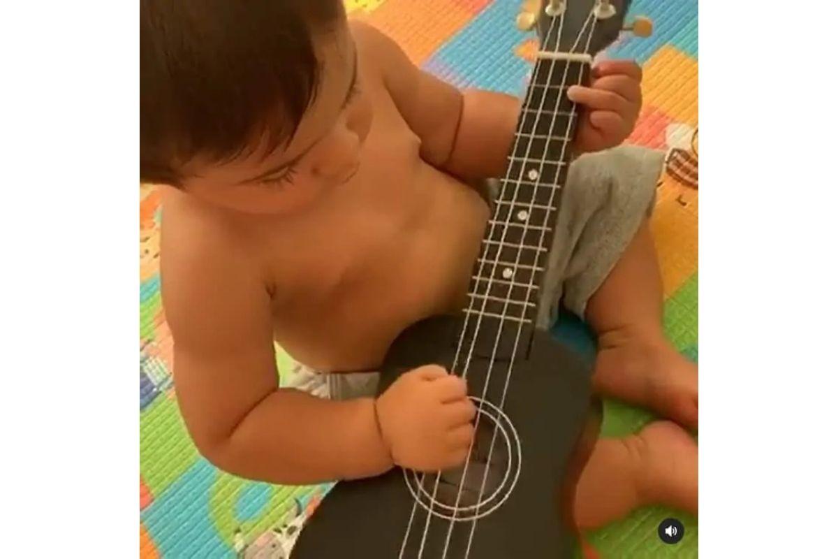 Com um pequeno violão, o bebê tocou as cordas e pareceu gostar bastante do instrumento. Ao mostrar essa linda cena, Zaida se derreteu pelo neto e fez provou que já apoia a carreira do menino. “Aneinnnn vovó! Já tá compondo meu lindinho!”, escreveu.