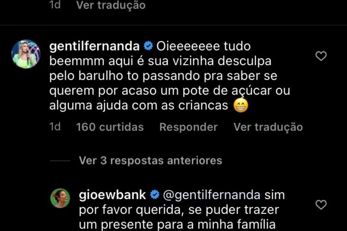 Depois, Giovanna mostrou nos Stories as interações com a nova vizinha. Fernanda, bem-humorada, escreveu: “Oie, tudo bem? Aqui é a sua vizinha. Desculpe pelo barulho, estou passando para saber se querem por acaso um pote de açúcar ou alguma ajuda com as crianças.”