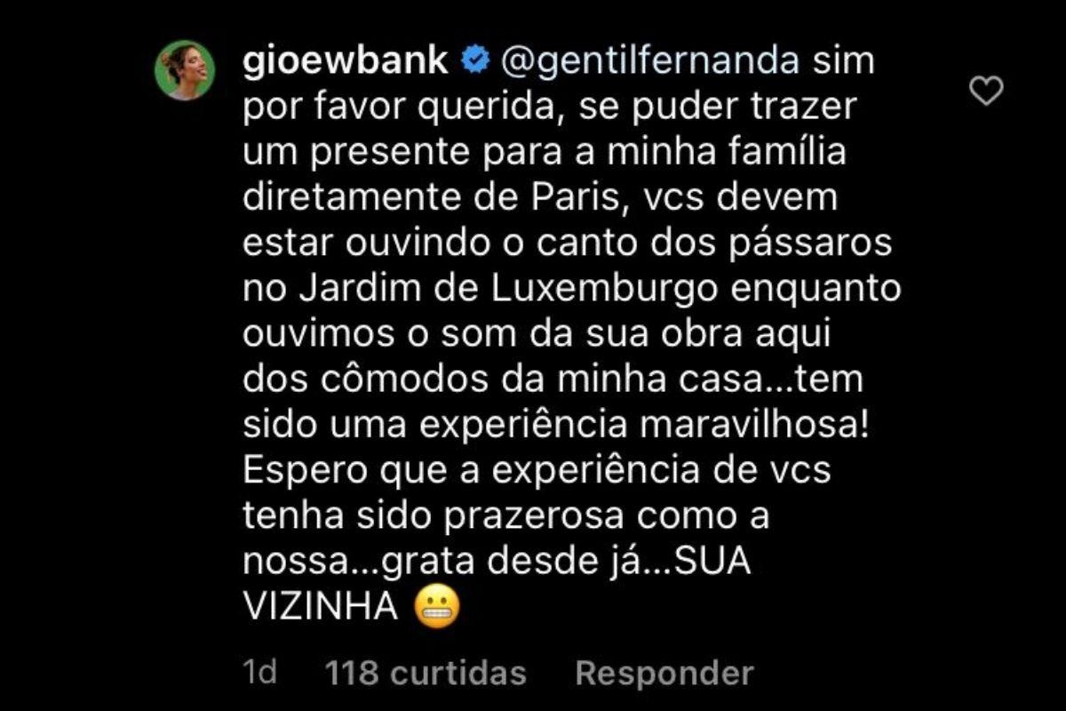 Na sequência, Giovanna ainda falou: “Ai, olha, Fernanda e Priscila, suas lindas e maravilhosas em Paris: Está legal aí? Está legal aí em Paris, gatas? O mínimo que eu quero por essa obra aqui do lado é um presente, tá? De boa vizinhança, que vocês serão. É o mínimo.”