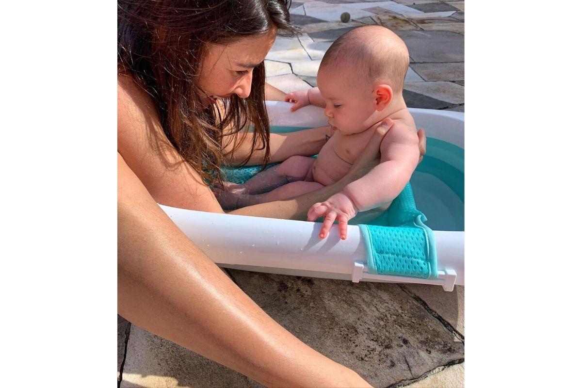 Desta vez, Giselle divertiu os fãs ao mostrar o menino tomando banho em uma piscina pequena. Ela escreveu: “Mí Pedro Lunito lucero y yo. La Mama elastica de cuerpo y alma. juntos siempre juntos mi hijo ♥️💦 📸dinda @ma_itie ♥️😘”.