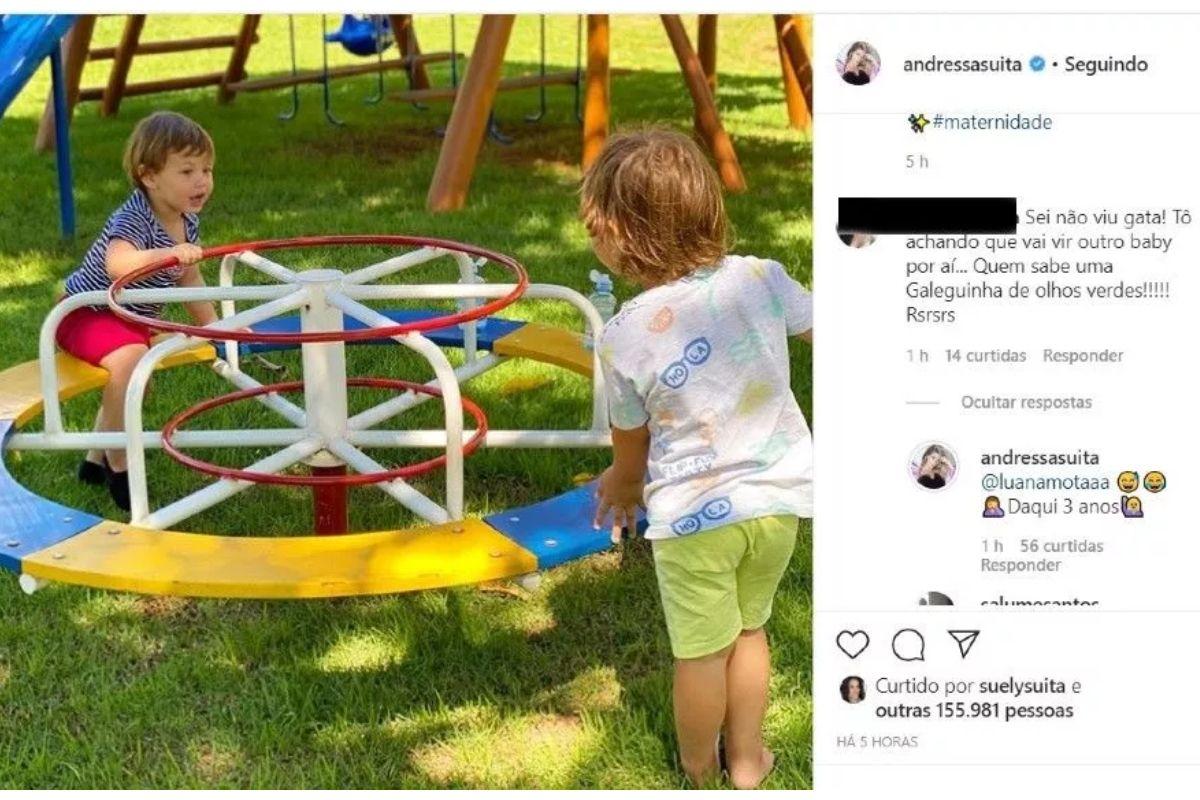 A modelo compartilhou uma foto da família nas redes sociais e uma fã comentou: “Sei não viu gata! Tô achando que vai vir outro baby por aí… Quem sabe uma galeguinha de olhos verdes! Hehehe!” e Andressa respondeu em seguida que não está gravida e deixou claro: “Daqui 3 anos!”.