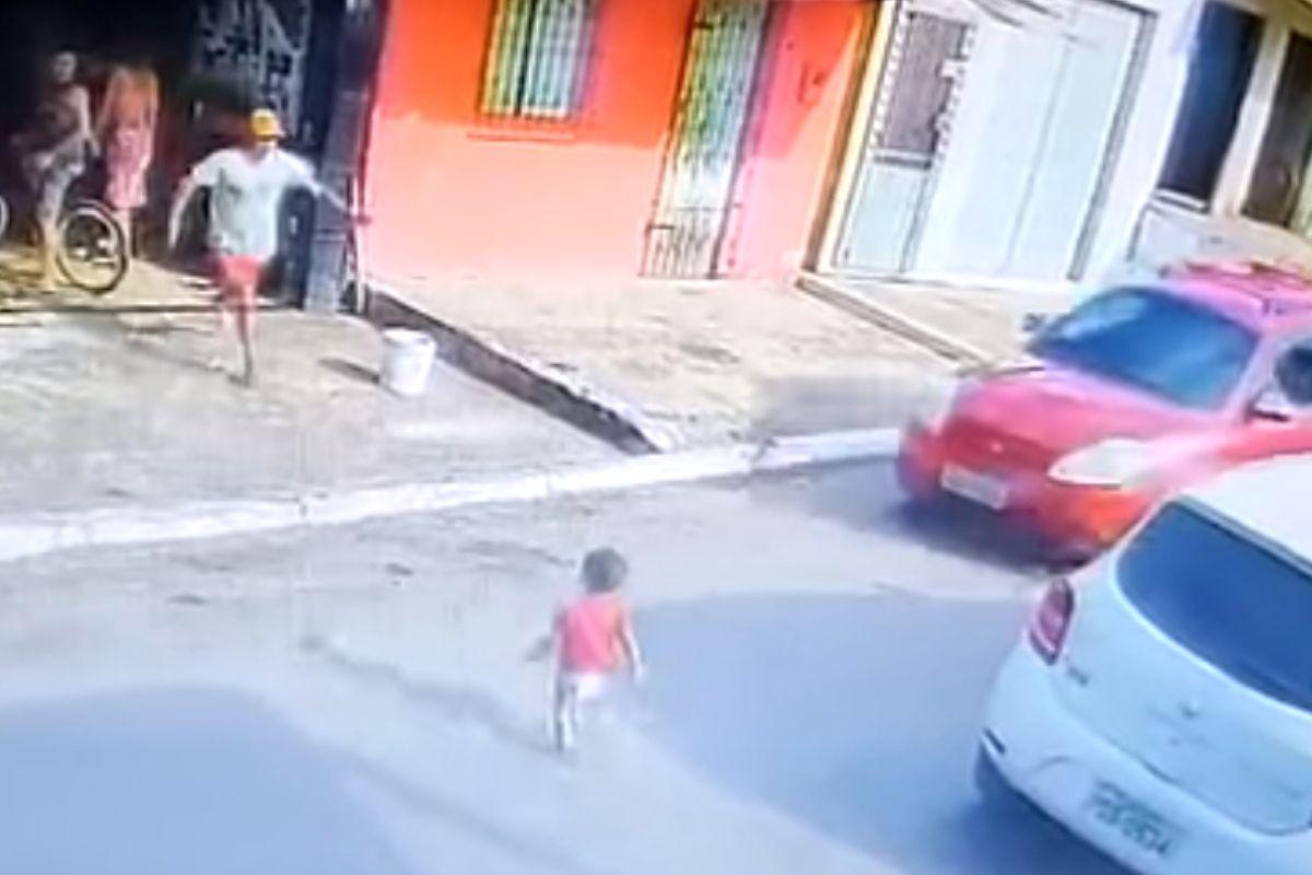 Nas imagens, é possível ver a criança atravessando a rua correndo, sem se dar conta que um automóvel estava vindo. Ao perceber a situação, um homem (cujo nome não foi revelado), saiu correndo, se jogou na frente do carro e conseguiu pegar a garota à tempo.